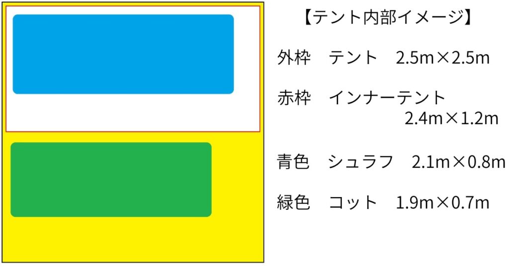 - フロアサイズが2.5×2.5m以上あれば、ソロ+荷物でも余裕あり